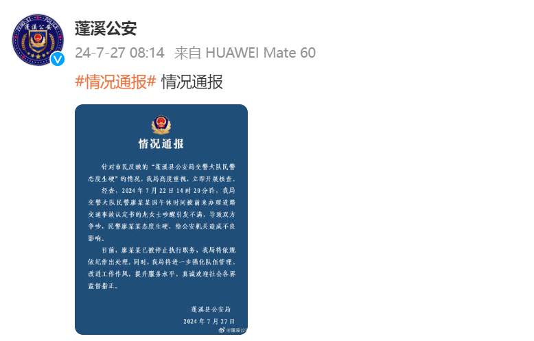 四川蓬溪警方通报“市民反映交警大队民警态度生硬”:廖某某已被停止执行职务