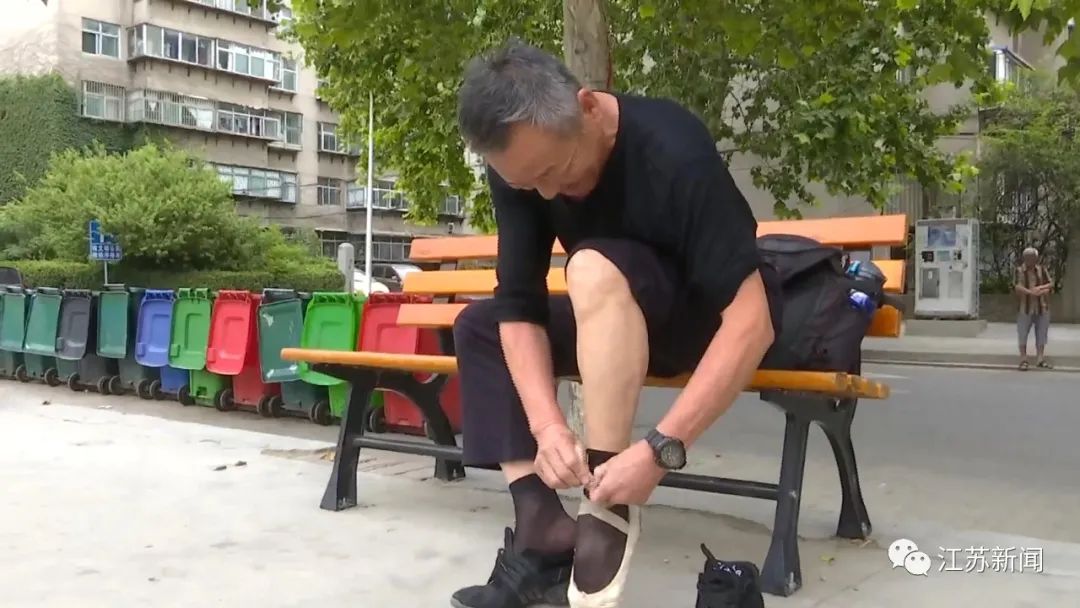 没有专业的训练场地,就在广场上找个平地,拿护栏当把杆;没有专业的装备,舞鞋娇贵,就自己改造,找鞋匠修补;户外训练,时间长了,彭大叔晒得脖子通红也仍然坚持。