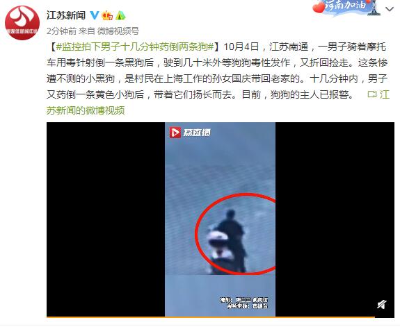 10月4日,江苏南通,一男子骑着摩托车用毒针射倒一条黑狗后,驶到几十米外等狗狗毒性发作,又折回捡走。这条惨遭不测的小黑狗,是村民在上海工作的孙女国庆带回老家的。十几分钟内,男子又药倒一条黄色小狗后,带着它们扬长而去。目前,狗狗的主人已报警。