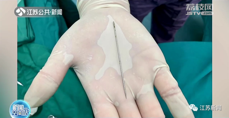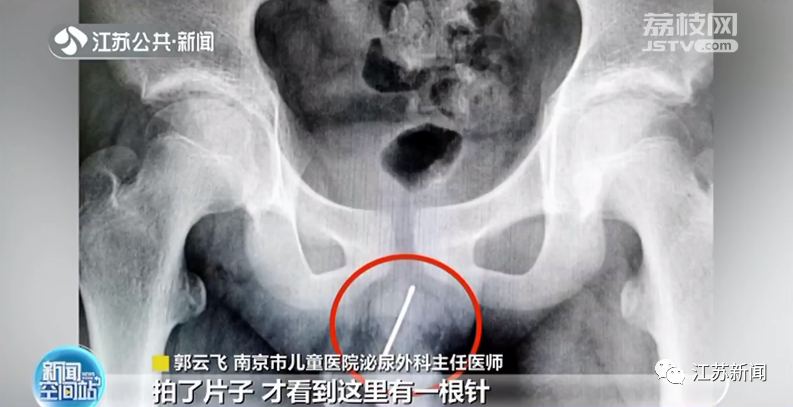 南京市儿童医院泌尿外科主任郭云飞告诉记者:“这个孩子是因为尿痛,小便有血,觉得实在是受不了了才到医院来拍了片子。我们看到这里有一根针,很长,而且也很深。”