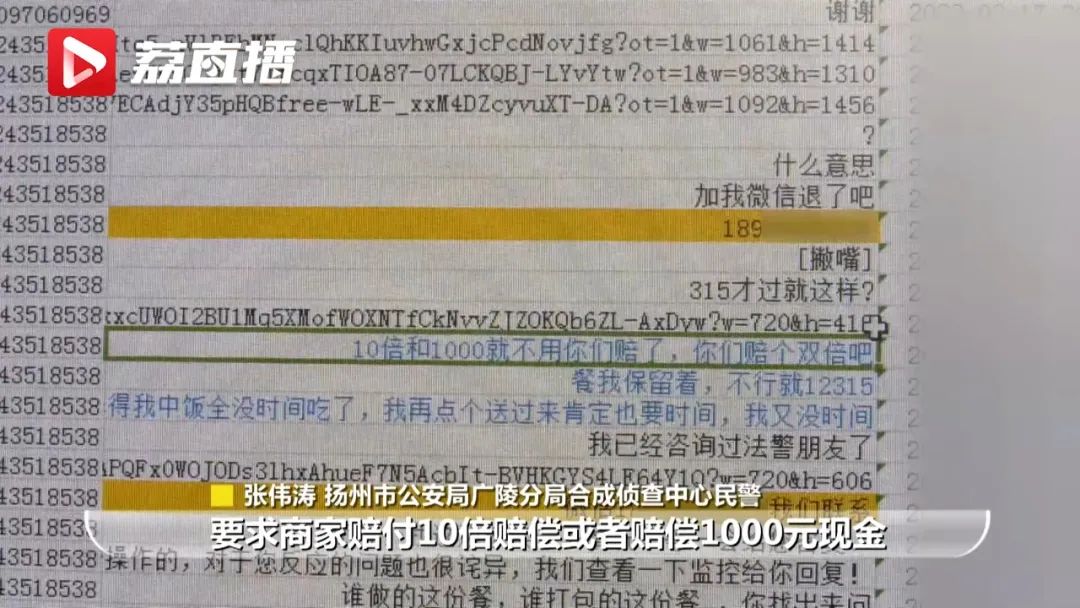 “用户以拨打110或者拨打12315举报给差评这样的手段,要求商家赔付10倍赔偿或者赔偿1000元现金,根据他的聊天内容,包括他的手段来看,我们暂时认为这是一个敲诈勒索的行为。”扬州市公安局广陵分局合成侦查中心民警张伟涛说。