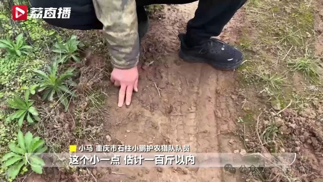 这个(野猪)估计有一百多斤,(爪子宽度)有三指。这个小一点,估计一百斤以内。这边全部都被拱了,这些都是昨天晚上拱的。