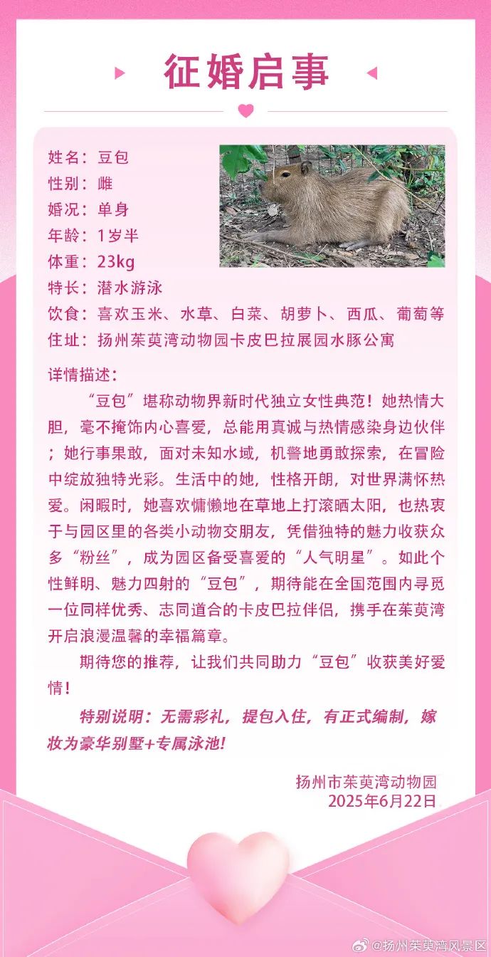 6月22日,“扬州茱萸湾风景区”官方微博发文,为曾出走两个月的卡皮巴拉“豆包”征婚: