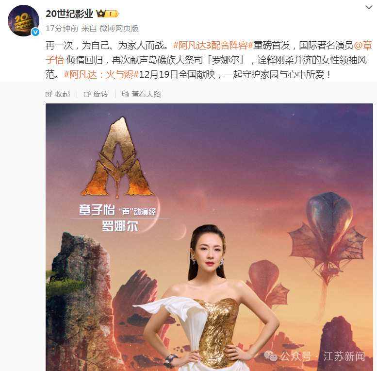12月4日,20世纪影业公布《阿凡达3》配音阵容: