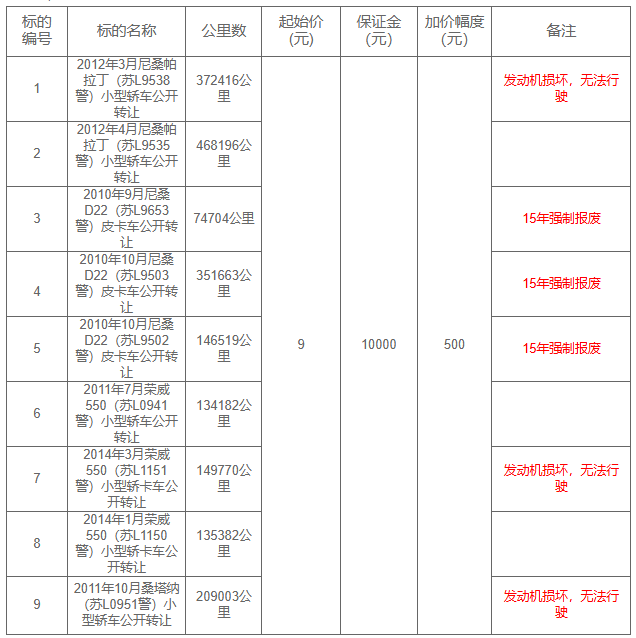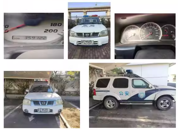 本次参与拍卖的9辆警车均为2010年至2014年出厂,涵盖尼桑帕拉丁、荣威550、桑塔纳等车型,这些车辆大多已达15年强制报废标准(皮卡)或发动机损坏无法行驶,且均无年检和保险,其中一辆2012年4月的尼桑帕拉丁已行驶超过46万公里。