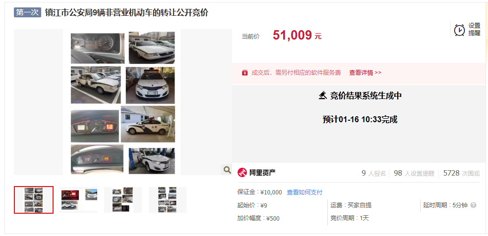历经24小时的线上竞价,今天(1月16日)上午10点多,镇江市公安局委托“阿里资产”平台拍卖的9辆退役警车成交。9元起拍,共有9人报名参拍,经过30次竞价,21次延时,最终以51009元被拍下。