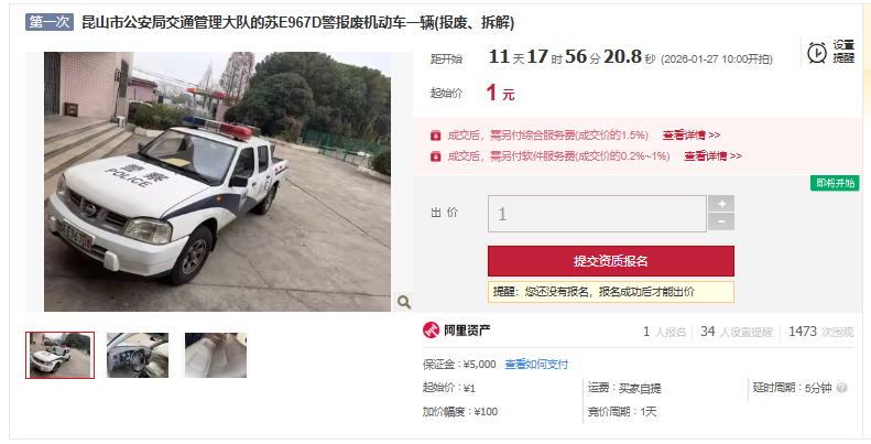 除镇江市公安局外,昆山市公安局交管大队的苏E987B警、苏E967D警报废机动车也将以起拍价1元,于1月26日、27日10点在“阿里资产”平台开拍。