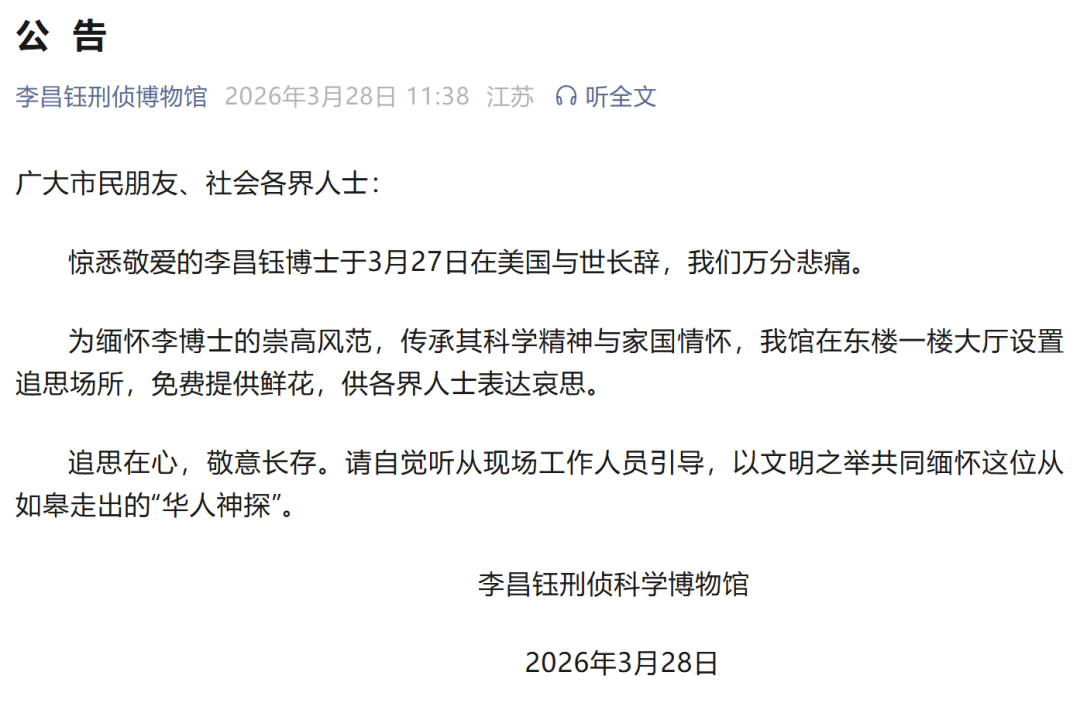 3月28日,位于江苏如皋市的李昌钰刑侦科学博物馆发布公告: