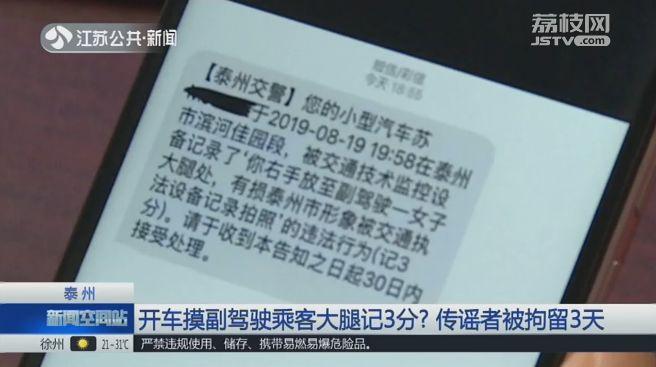 传播这条消息的是一个抖音账号,消息的内容为:您的小型汽车被交通技术监控设备记录了"你右手放至副驾驶一女子大腿处,有损泰州市形象被交通执法设备记录拍照"的违法行为,记3分。