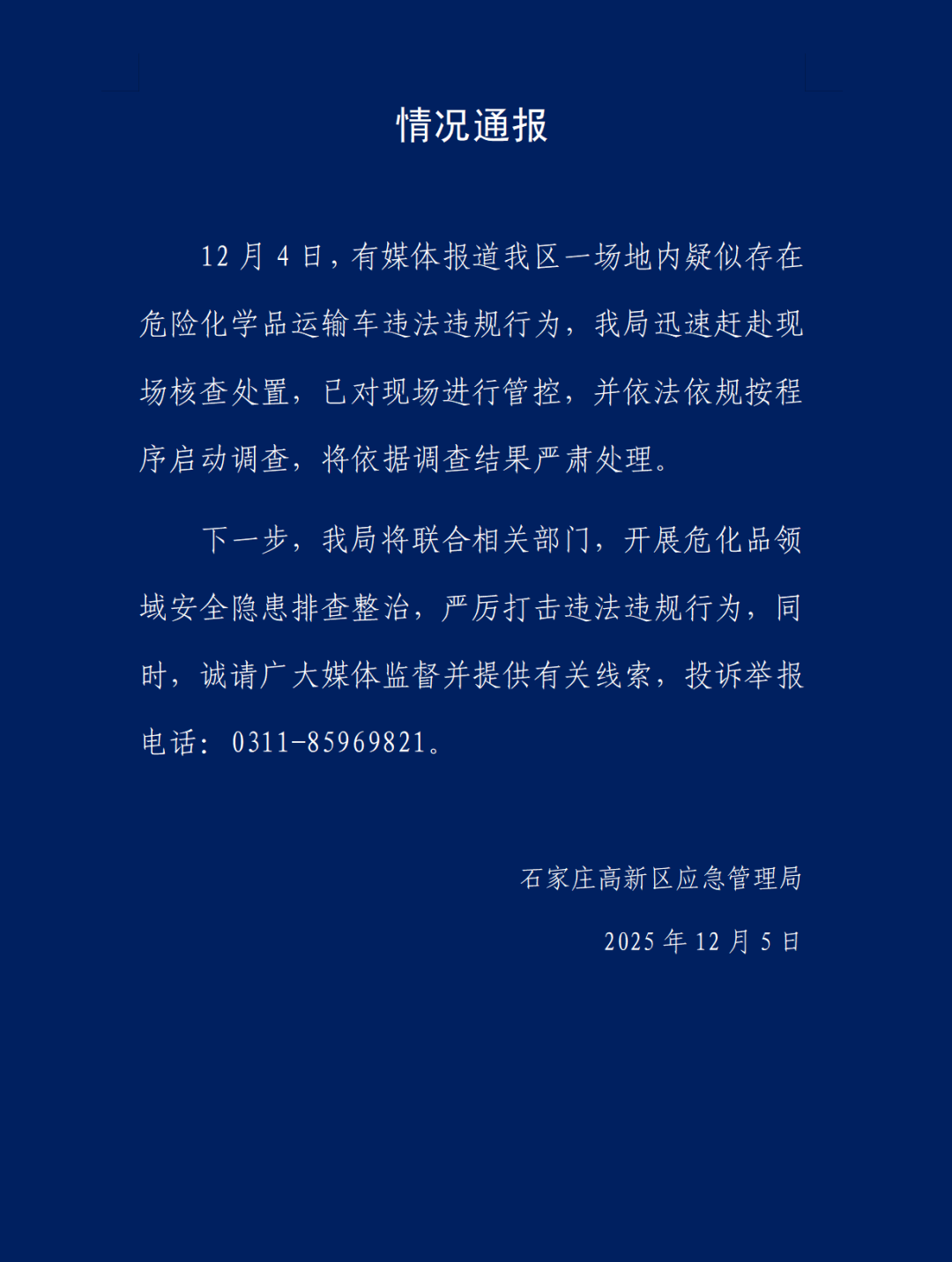 石家庄高新区通报疑似存在危险化学品运输车违法违规行为:已对现场进行管控