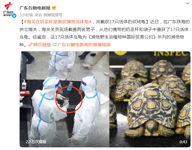 近日,在广东珠海的拱北海关,海关关员现场截查两名男子,从他们携带的奶茶杯和袋子中查获了17只活体乌龟。经鉴定,这17只活体乌龟为《濒危野生动植物种国际贸易公约》所列的濒危物种。