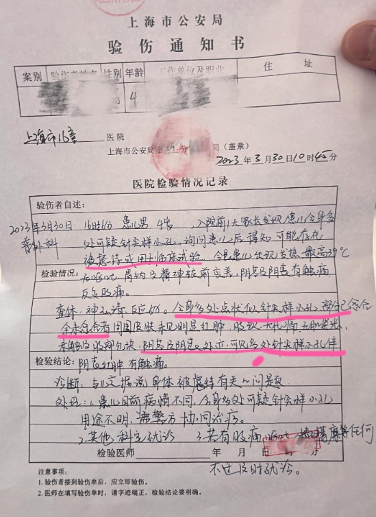 3月27日,有家长报警,警方开出验伤单让孩子在医院验伤,“当日警方开了验伤单去验伤,因为身上多处淤青 。后几天警方又开了验伤单,儿童医院的医生找到多处点状似针尖样小孔 。”