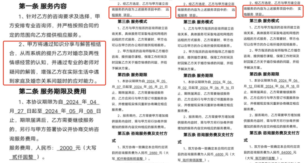 “2000元的心理咨询就是给我一些材料,让我去自学,没提供什么咨询服务,2880元的‘远程介入’是丽丽(涉事公司工作人员)说他们公司的远程团队加男友微信,了解男友真实想法,但男友没加我微信也没找我复合。我在购买这两个服务后,发现没效果,丽丽便说见面就能和好,说要帮我约见前任,让我再付6800元‘双向远程’服务的钱帮我约见男友,见面后,男友却叫我去相亲,说以后再也不见面了。”投诉人吕方说。