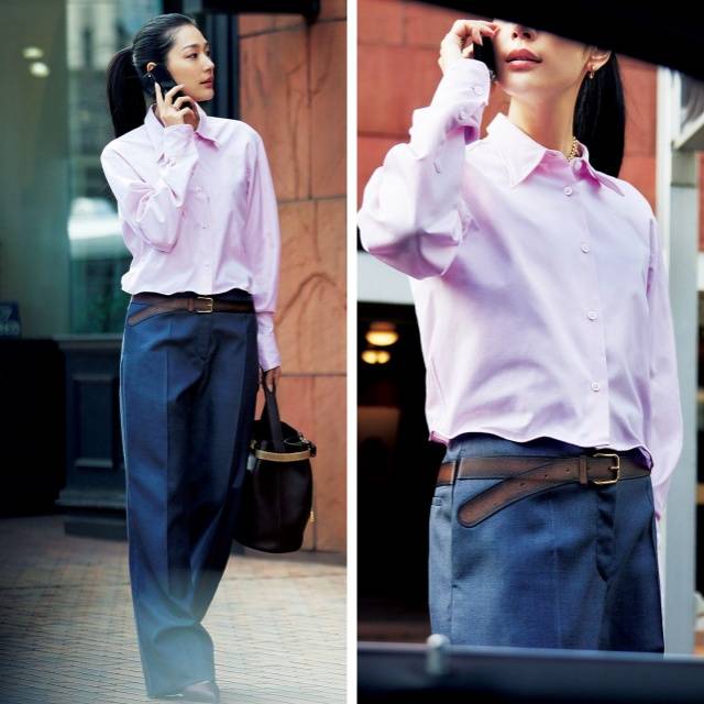 这件衬衫采用都市时尚元素,整体干净利落,兼具优雅与个性。搭配上独特的“金色扣棕色腰带”,乍一看仿佛是正统皮带为造型加分,提升了整体的层次感和精致度。