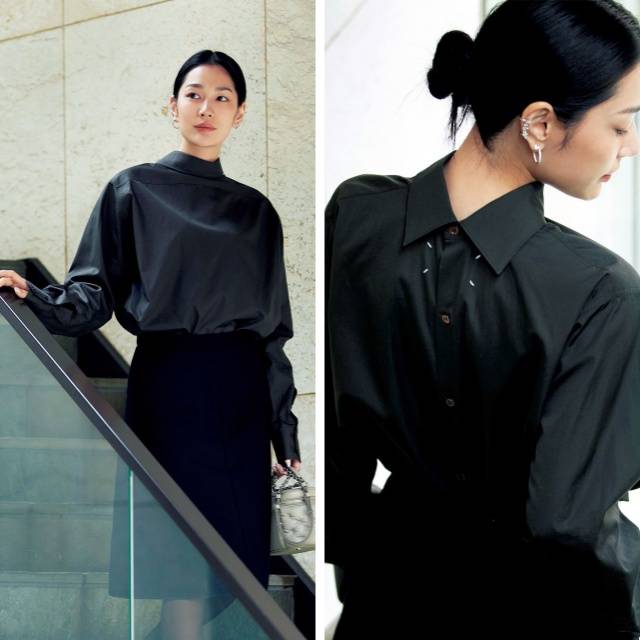 这套别致造型,采用了高领衬衫和黑色膝下长裙的组合,看似简约,却富有设计感。整体搭配低调优雅,突出了极简美学的高级氛围。然而,在细节处却隐藏着令人惊喜的小心机——当擦肩而过、回头一瞥,会注意到脖子后方别具一格的项圈装饰。