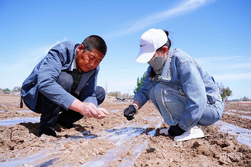 农技人员正在查看播种情况 (央广网发 吴欣昊 摄)