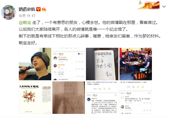 编剧鹦鹉史航更新:“赖宝走了,一个有意思的朋友,心梗去世。他的微博戳在那里,看着难过……赖宝走好。”