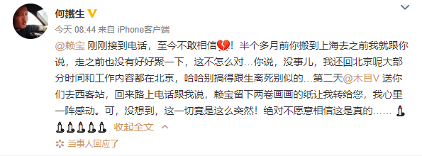 7月20日早晨,书画家何铁生在社交平台发文悼念,“半个多月前你搬到上海去之前我就跟你说,走之前也没有好好聚一下,这不怎么对…你说,没事儿,我还回北京呢大部分时间和工作内容都在北京,哈哈别搞得跟生离死别似的…”“可,没想到,这一切竟是这么突然!绝对不愿意相信这是真的”。
