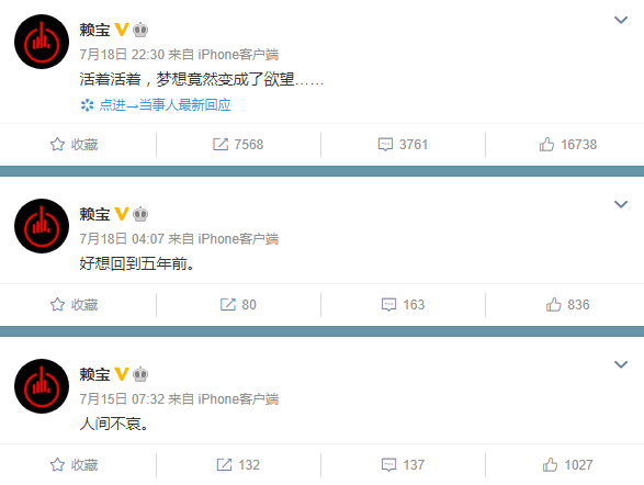 但在7月18日的前几天,赖宝就已经有些反常,开始怀念过去,文字间难掩悲伤之意。