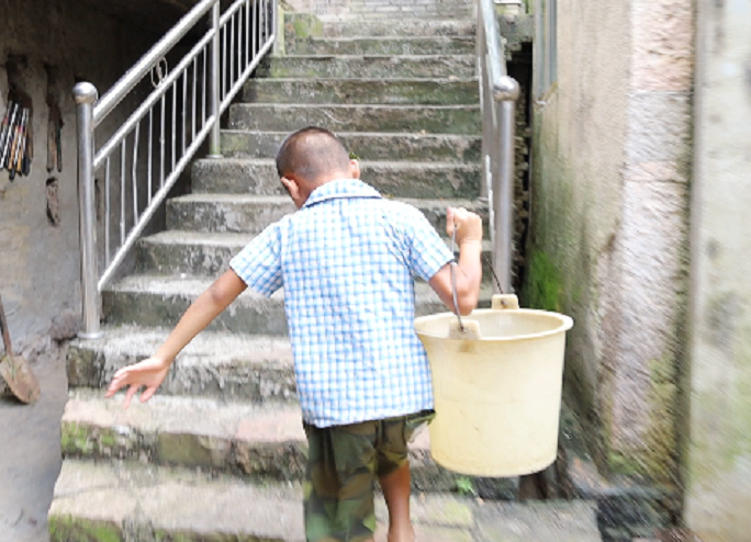 到家后,小华拿出妈妈刚刚换下的衣服洗了起来。洗完后又拿着水桶在一楼接水提往二楼倒在水缸里。母亲黄国娴说,小华每次只能提半桶水,每天要取10次水才能保证他们母子三人一天的基本用水。