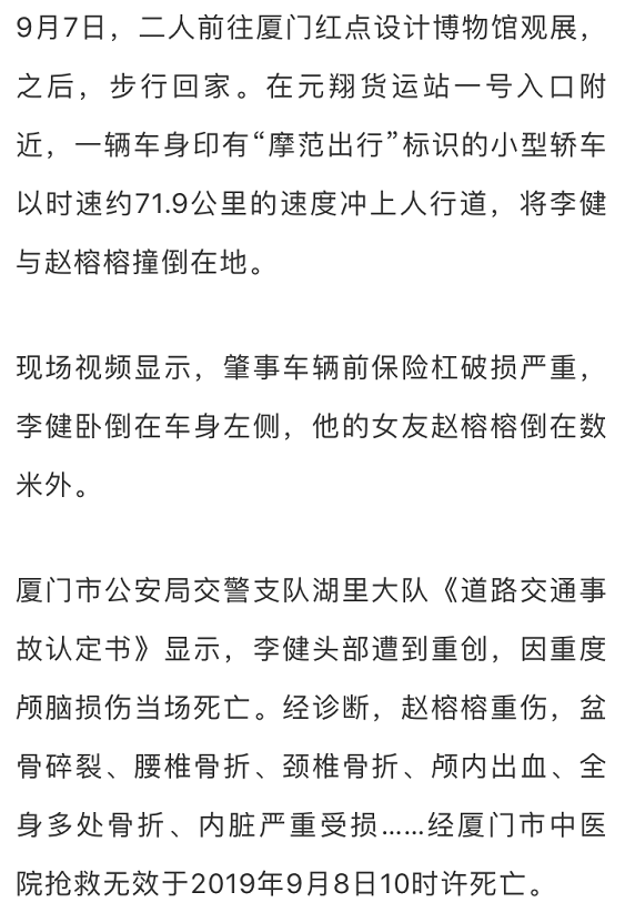 9月7日17时38分,福建厦门元翔货运站门口,“摩范出行”一辆共享汽车冲入人行道,正面撞上厦门大学一对教师情侣——28岁的李健当场死亡,其女友赵榕榕被撞致重伤,经厦门市中医院抢救无效,于第二日死亡。