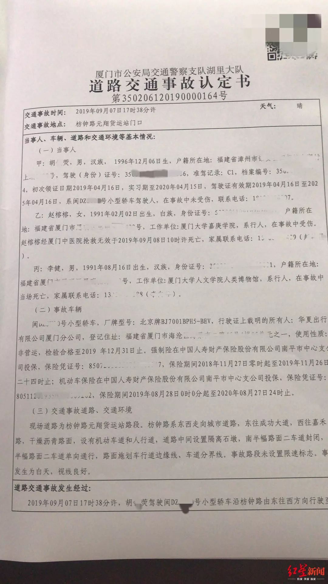 厦门市公安局交警支队湖里大队编号为“第350206120190000164号”的《道路交通事故认定书》显示,23岁肇事男子胡某荧领取驾照不足5个月,未在车后粘贴实习标志,负全责。