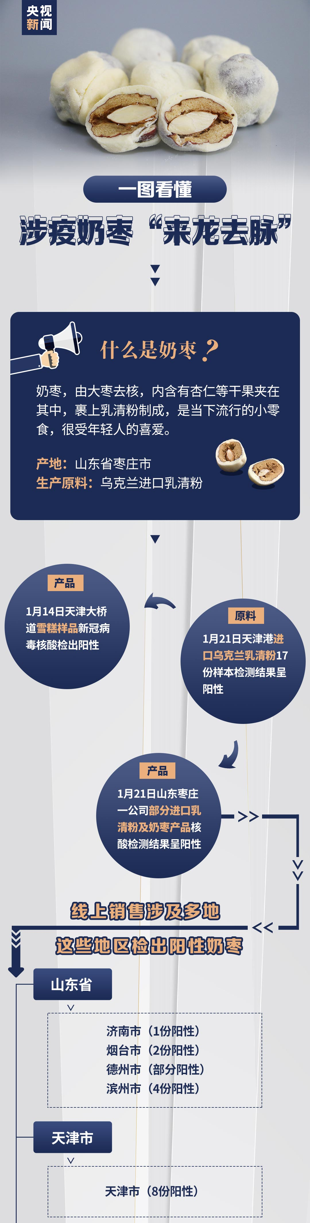 另据@齐鲁网消息,2月1日,记者从“涉疫‘奶枣’事件有关情况发布会”获悉,2021年1月18日18时,山东省市场监管局收到天津市市场监管委通报,捷华(天津)国际贸易有限公司经天津港从乌克兰进口的乳清粉,在天津市对涉疫食品进口原料乳清粉核酸检测时结果为阳性,其中同批次进口的10吨乳清粉销往山东久旭生物科技有限公司。