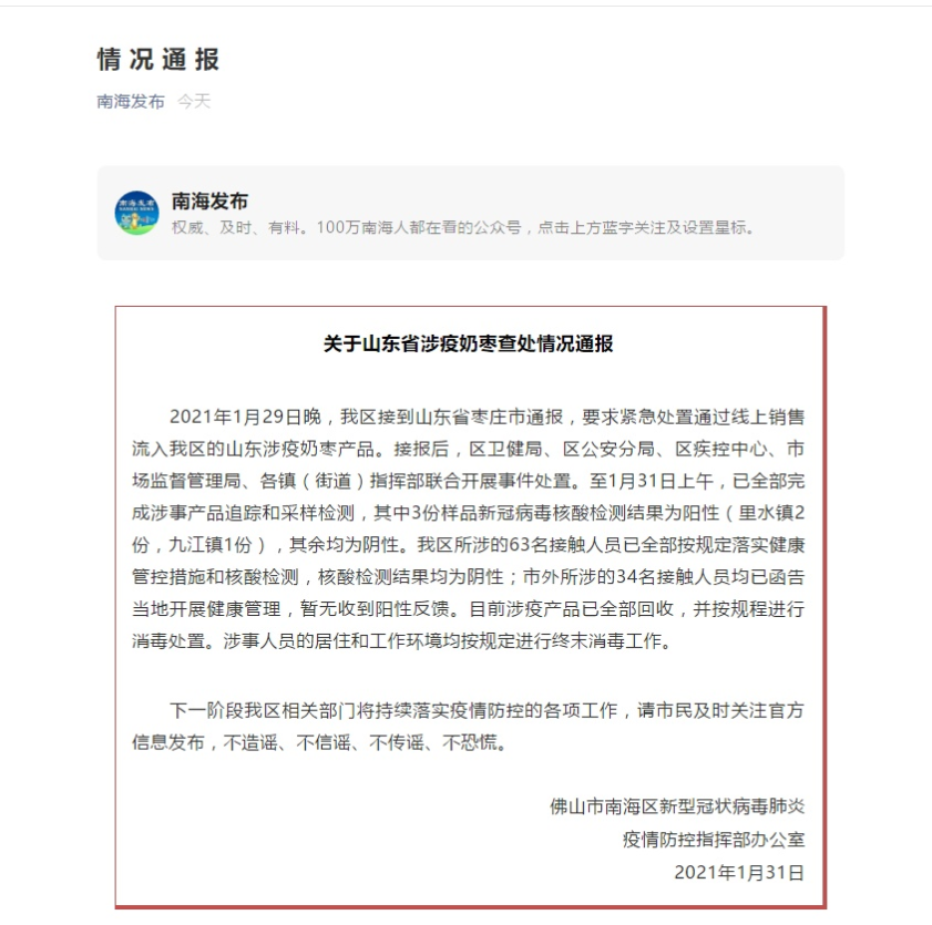 2月1日,据南海区委宣传部官方微信公号“南海发布”通报,1月29日晚,南海区接到山东省枣庄市通报,要求紧急处置通过线上销售流入南海区的山东涉疫奶枣产品。接报后,区卫健局、区公安分局、区疾控中心、市场监督管理局、各镇(街道)指挥部联合开展事件处置。全文如下: