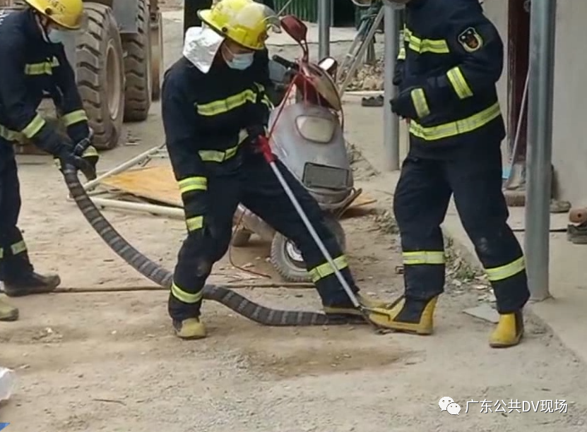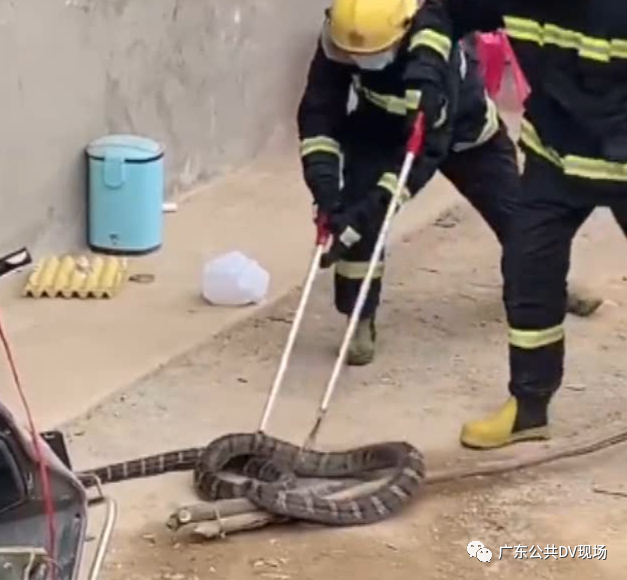 当蛇一出房间,消防队员立即用棍头压住蛇头,其它两位消防队员立即上前踩住蛇头和拉住蛇尾用蛇夹控制。