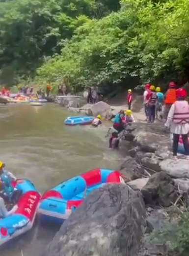 6月10日,河南三门峡一旅游景区游客被卡在漂流赛道 ,被后方的漂流船撞上后,两名游客双双落水,漂流船倒扣在两人头上 ,并且跟着湍急的水流往前冲。