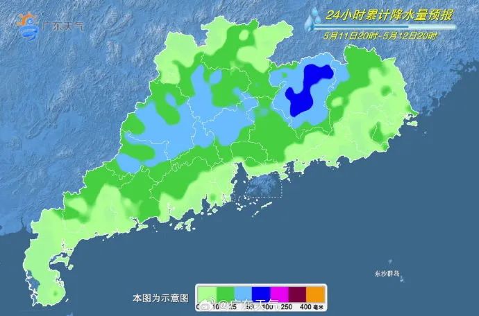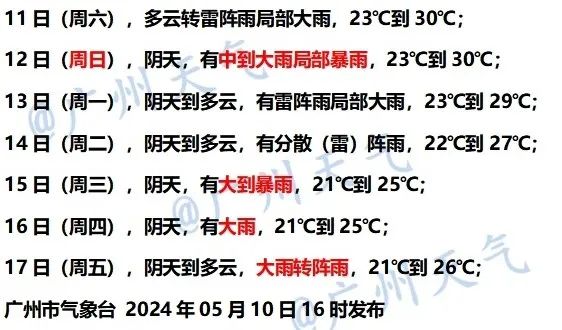 气象台预计,5月11日-12日,珠江三角洲、粤北、粤东大部有中到强雷雨,雷雨时伴有短时强降水、8-10级短时大风、局地冰雹等强对流天气。