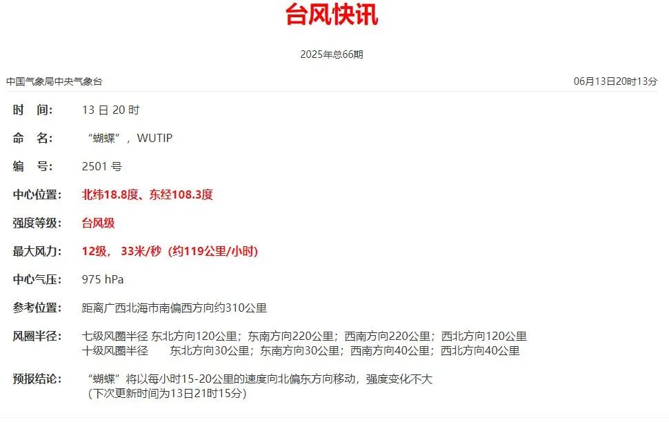 据@广州天气,13日20时,台风“蝴蝶”中心位于广州西南方向约720公里的海南岛西部近海海面上,中心附近最大风力12级(33米/秒),达到了台风级标准!