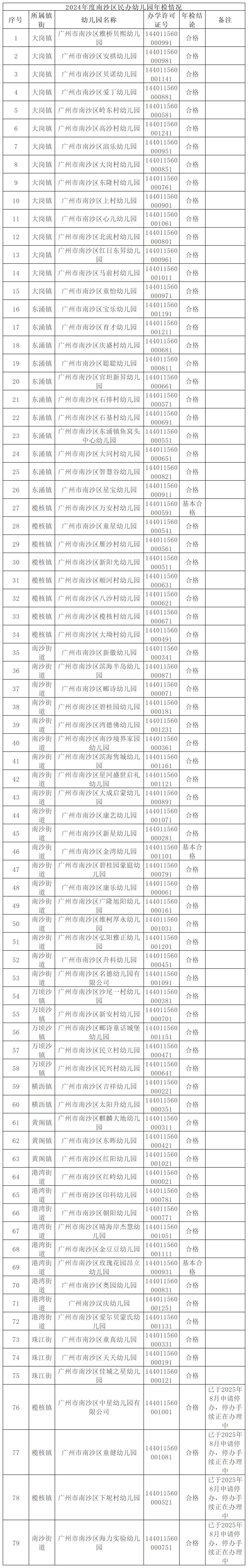 近日,南沙区教育局发布《南沙区民办幼儿园2024年度年检结论公告》(以下简称《公告》)。《公告》显示,南沙区有79所民办幼儿园属于2024年度年检范围。其中,南沙区有4所幼儿园已经申请停办,分别是广州市南沙区中星幼儿园、广州市南沙区童健幼儿园、广州市南沙区下坭村幼儿园、广州市南沙区海力实验幼儿园。