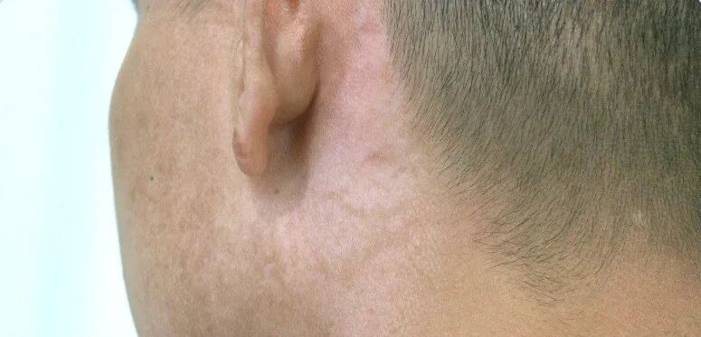 一名伤者脸部、耳后被烧伤。画面由伤者提供