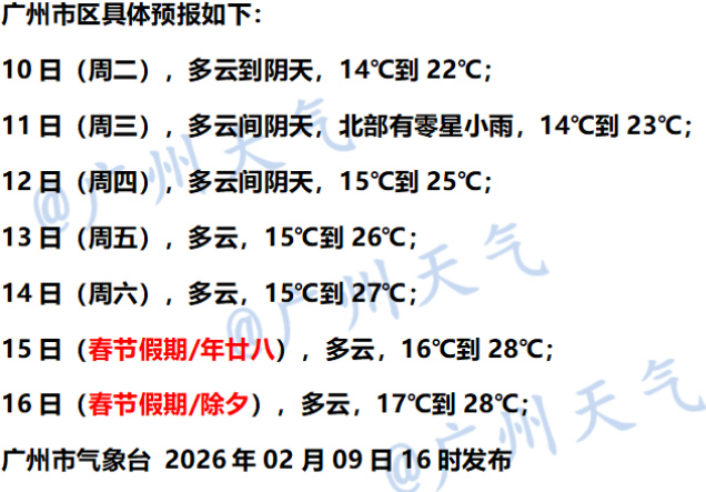 广州市气象台预计,广州2月10日多云到阴天,2月11日北部有零星小雨,2月12日以多云为主,气温逐渐回升。