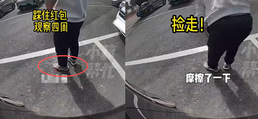 从孩子母亲聂女士提供的监控视频可见,该男子发现地上红包后,先是用脚踩住红包,随后观察四周,确认无人注意后迅速将红包捡起离开。