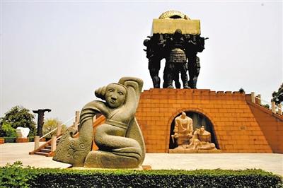 古城上有四个武士,他们肩负金印,城门洞四组雕塑分别为农业、手工业、商业、渔业,象征着当时的经济繁荣。广场四周的二十件雕塑均以出土文物造型为基础进行创作,再现当时辉煌。