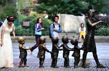 左图为夏日的沙面,一个新娘跟在一群雕塑娃娃后头,聆听幸福的音符。