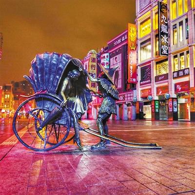 上下九步行街 夜色中,雕塑《黄包车》勾起老广州百年岁月的回忆。