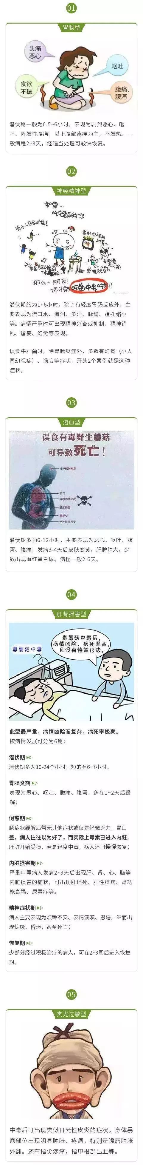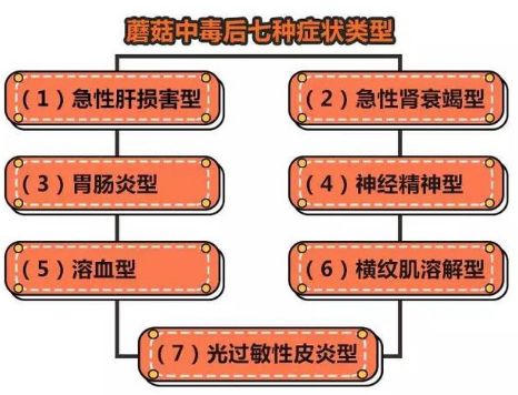 不同种类的毒蘑菇中毒症状不一样,可分为急性肝损害型、急性肾衰竭型、胃肠炎型、神经精神型、溶血型、横纹肌溶解型和光过敏性皮炎型7种类型。