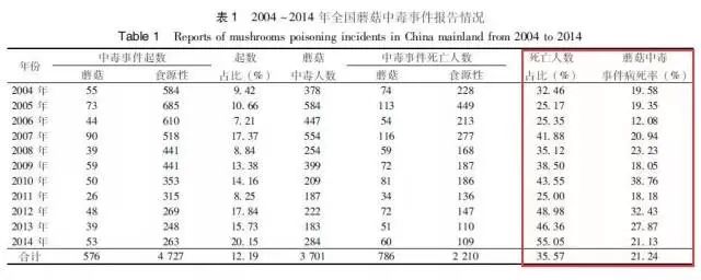2004-2014年我国“突发公共卫生事件报告管理信息系统”报告显示,11年间共报告毒蘑菇中毒事件576起,致3701人中毒,死亡786例,病死率为21.24%,病死率居突发公共卫生事件之首。