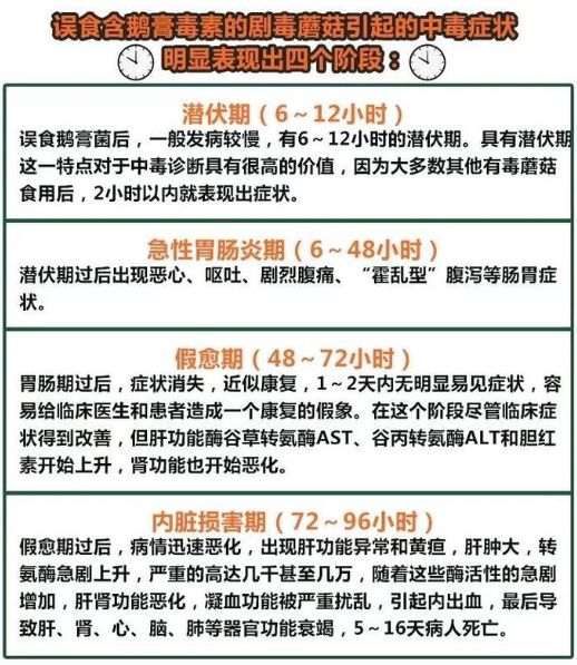 尤其在1~2天内,胃肠道症状消失后,中毒患者再次没有了明显症状,特别容易造成一个康复的假象,称为患者 “假愈期”。殊不知。在此期间,毒素会偷偷地破坏中毒者的肝脏。它会和人体内负责产生新蛋白质的一种酶结合并使其失效。缺少了这种酶,细胞便不再工作,最终的结果就是肝功能衰竭。如果没有接受及时、准确的治疗,中毒者很快就会器官衰竭、休克,最后死亡!