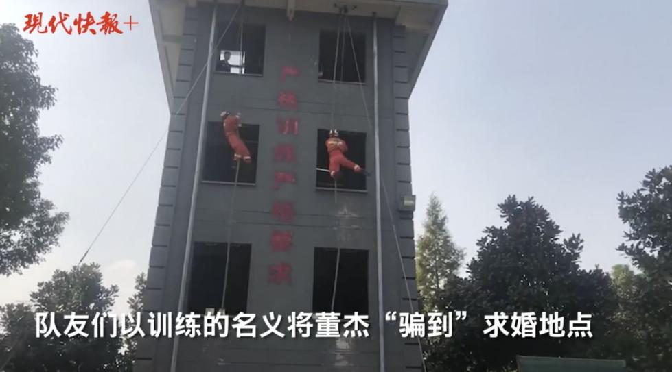 战友早有准备,将董杰放在宿舍的钻戒拿到了操场上,绑在了无人机上。载着钻戒的无人机升空,飞到了训练塔4楼窗口。在战友的提醒下,董杰取下戒指半跪在女友跟前,一直说:“我都蒙了!准备的台词一句都不记得了!”