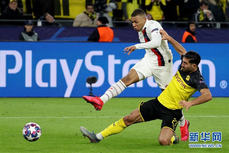 2月18日,巴黎圣日耳曼队球员姆巴佩(上)在比赛中与多特蒙德队球员埃姆雷·詹拼抢。 当日,在德国多特蒙德举行的2019-2020赛季欧冠联赛八分之一决赛首回合比赛中,德甲多特蒙德队主场以2比1战胜法甲巴黎圣日耳曼队。 新华社发(约阿希姆·毕瓦勒兹 摄)