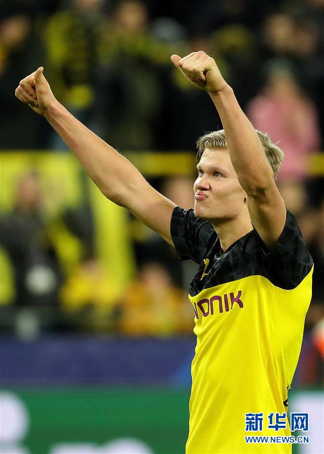 2月18日,多特蒙德队球员哈兰德在比赛后庆祝。 当日,在德国多特蒙德举行的2019-2020赛季欧冠联赛八分之一决赛首回合比赛中,德甲多特蒙德队主场以2比1战胜法甲巴黎圣日耳曼队。 新华社发(约阿希姆·毕瓦勒兹 摄)