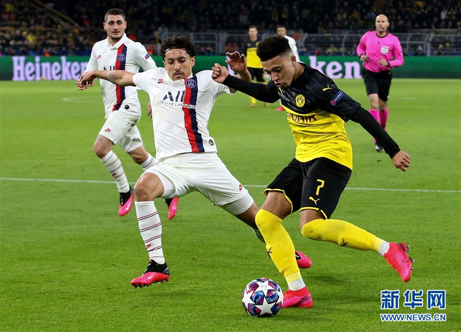 2月18日,巴黎圣日耳曼队球员马基尼奥斯(前左)在比赛中与多特蒙德队球员桑乔(前右)拼抢。 当日,在德国多特蒙德举行的2019-2020赛季欧冠联赛八分之一决赛首回合比赛中,德甲多特蒙德队主场以2比1战胜法甲巴黎圣日耳曼队。 新华社发(约阿希姆·毕瓦勒兹 摄)