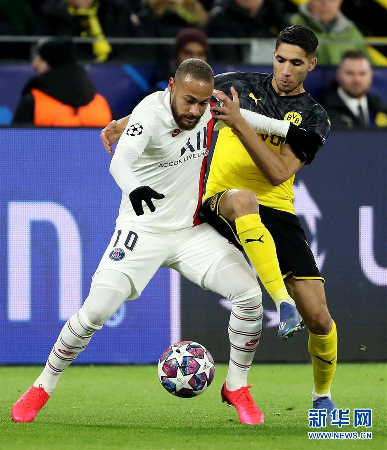 2月18日,巴黎圣日耳曼队球员内马尔(左)在比赛中与多特蒙德队球员哈基米拼抢。 当日,在德国多特蒙德举行的2019-2020赛季欧冠联赛八分之一决赛首回合比赛中,德甲多特蒙德队主场以2比1战胜法甲巴黎圣日耳曼队。 新华社发(约阿希姆·毕瓦勒兹 摄)