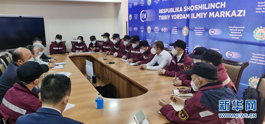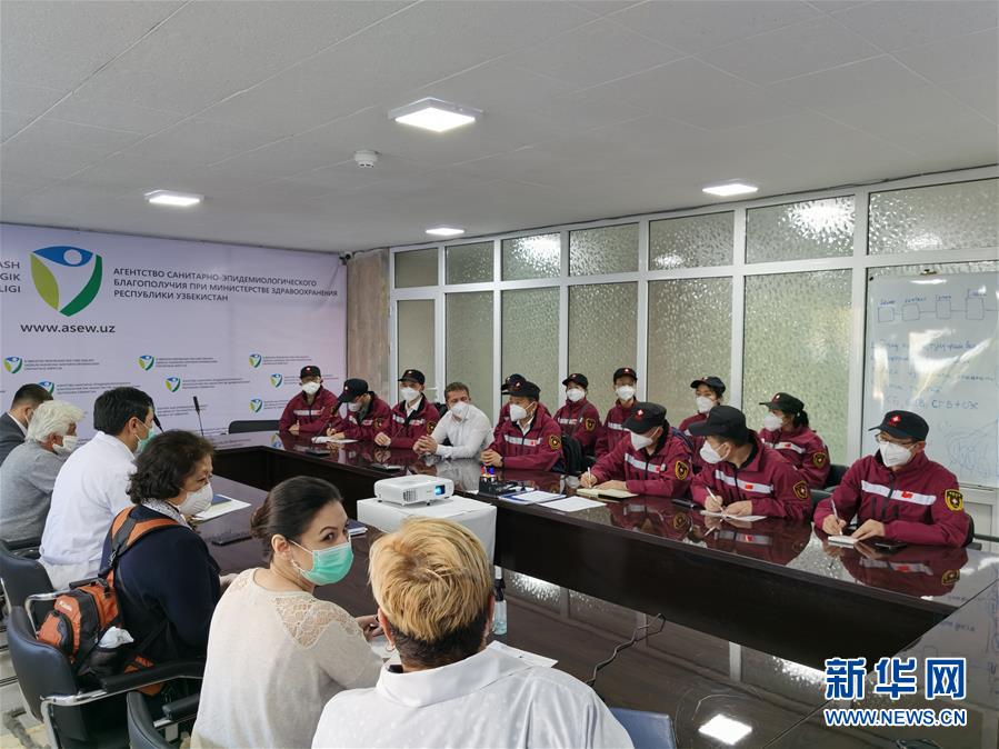 4月18日,在乌兹别克斯坦首都塔什干,中国政府联合医疗工作组成员与乌兹别克斯坦专家交流抗疫经验。 18日,中国政府联合医疗工作组赴乌兹别克斯坦急救中心和乌兹别克斯坦卫生和流行病学署开展工作,同乌方专家就新冠肺炎疫情防控、疾病救治等交流经验。 新华社发(中国驻乌兹别克斯坦大使馆提供)
