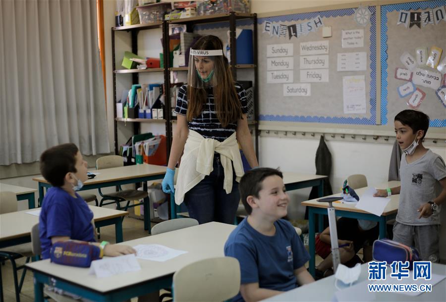 5月3日,在以色列中部城市莫迪因的一所小学,佩戴口罩的学生们重返校园。 以色列总理办公室5月1日发表声明说,总理内塔尼亚胡当天就学校逐步开学复课举行内阁会议评估形势后决定,从5月3日起,以色列小学低段(1-3年级)和11至12年级的学生复课。 新华社发(吉尔·科恩·马根 摄)