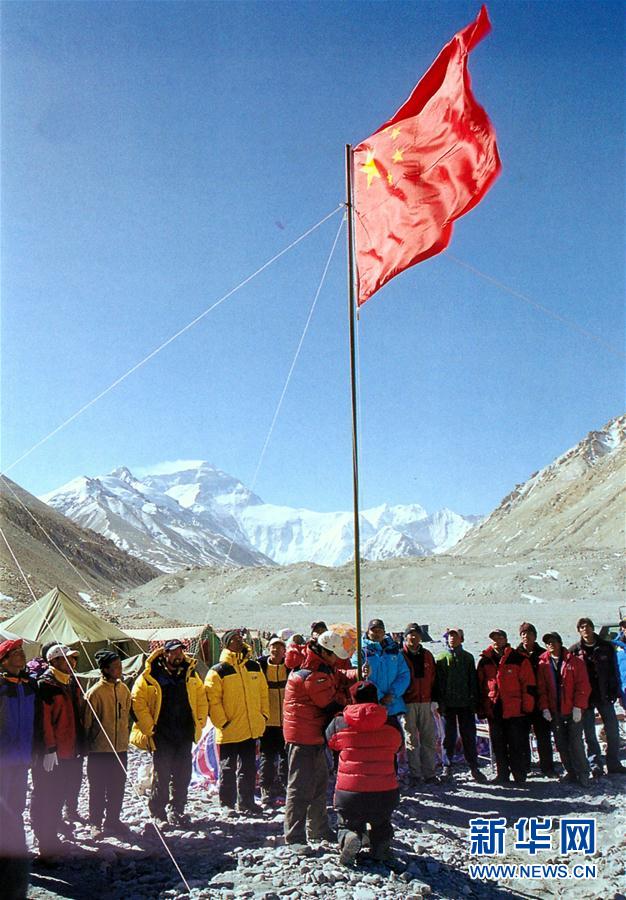 1960年5月25日,中国登山运动员王富洲、贡布、屈银华三人首次从北坡登上珠穆朗玛峰,创造了人类历史上第一次从北坡登上世界第一高峰的壮举。登山勇士们不畏险阻、一往无前的精神,鼓舞着一代代登山人向着珠穆朗玛峰前进。 这是2008年5月8日,北京奥运圣火珠峰传递登山队成功登顶珠峰,中国登山队员在峰顶展示中国国旗、奥运五环旗和北京奥运会会徽旗。 新华社发